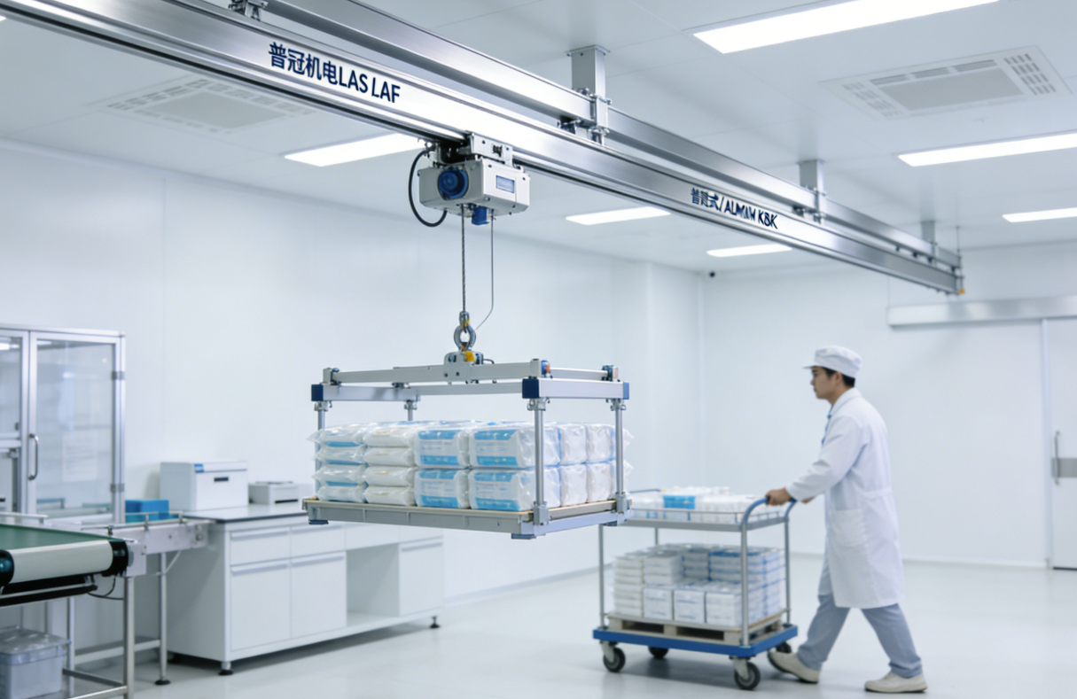 针对医疗、食品等对洁净度有极高要求的行业,普冠机电主推的铝合金KBK起重机(如LAS悬挂式、LAF自立式) 成为了“无菌搬运卫士”。其采用的高品质铝合金型材,表面光滑不易积尘,且自重轻、推拉力小,完美适配医疗耗材洁净流水线与食品包装线。在某医疗包装线的改造项目中,普冠的铝合金KBK系统替代了传统笨重设备,不仅根除了油污污染风险,更因其灵巧特性使操作工能够快速、精准地搬运物料,帮助企业提升了约30%的包装流转效率,真正实现了“轻量化”与“高洁净”的双重革新。