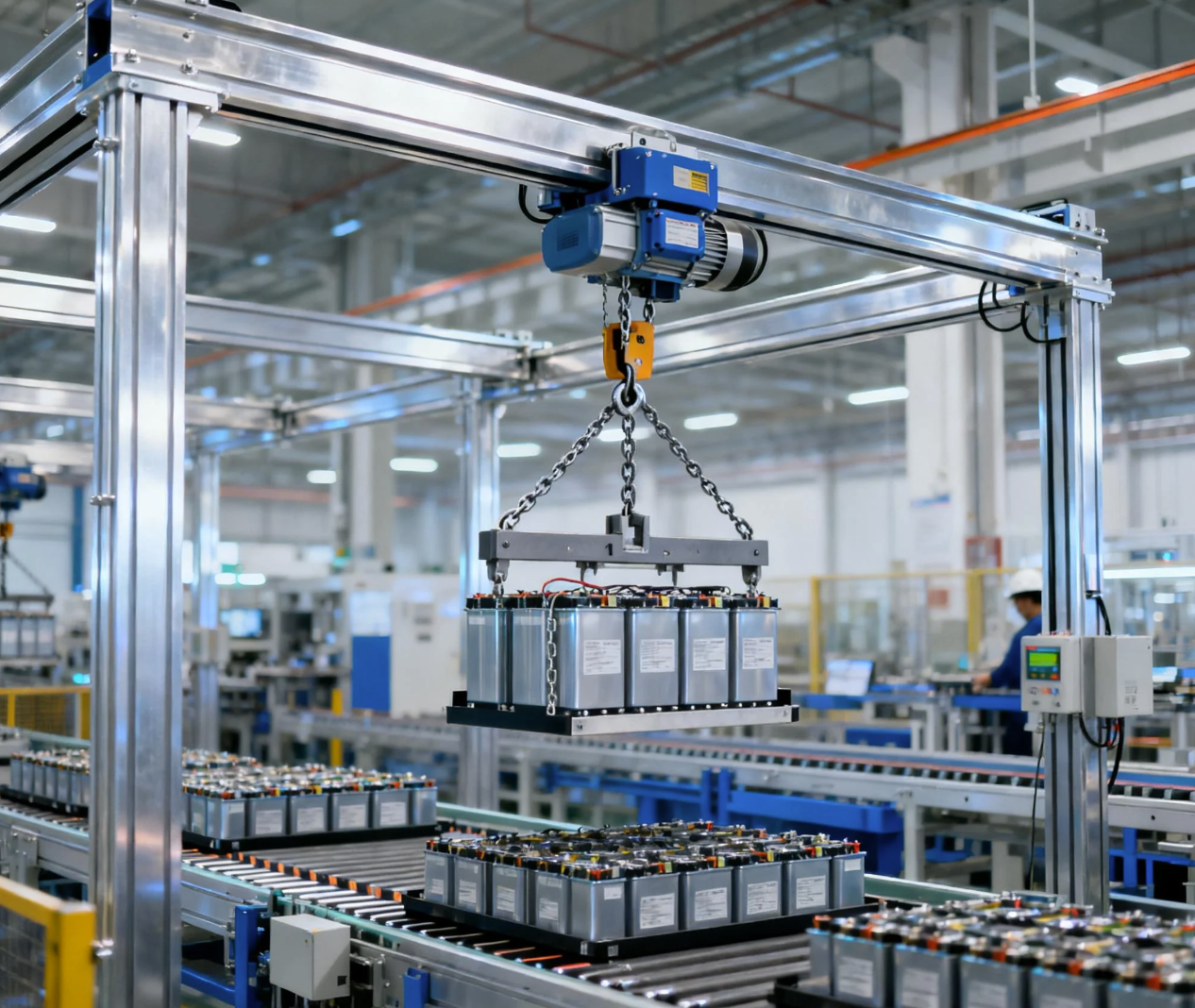 在新能源电池及储能系统制造领域,面对电池模组重量大、精度要求高、安全规范严苛的挑战,普冠机电的刚性KBK起重机(如LCF自立式、LCX悬挂式) 展现出了卓越的性能。近期为某锂电池PACK线安装的KBK系统,通过高刚性设计与精准的轨道对接,实现了电池组件的无冲击搬运,有效避免了装配过程中的损伤风险,助力客户将瑕疵率控制在极低水平。同时,结合环链电动平衡吊,为产线工人提供了流畅的“漂浮”操作体验,显著提升了装配效率。